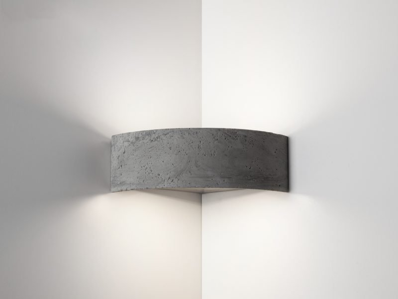 LED angular wall lamp made of CONCRETE® indoor, with dual light emission. Featuring a rounded shape, the light is diffused upward and downward. The corner installation ensures illumination continuity