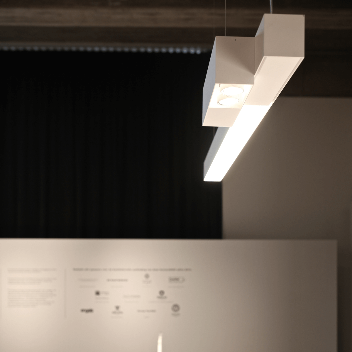 Metroffice is a contemporary light fixture that fits perfectly above a meeting table or in open space style offices. This model is available in different sizes and colours and in two installation variants: suspension and ceiling mount.